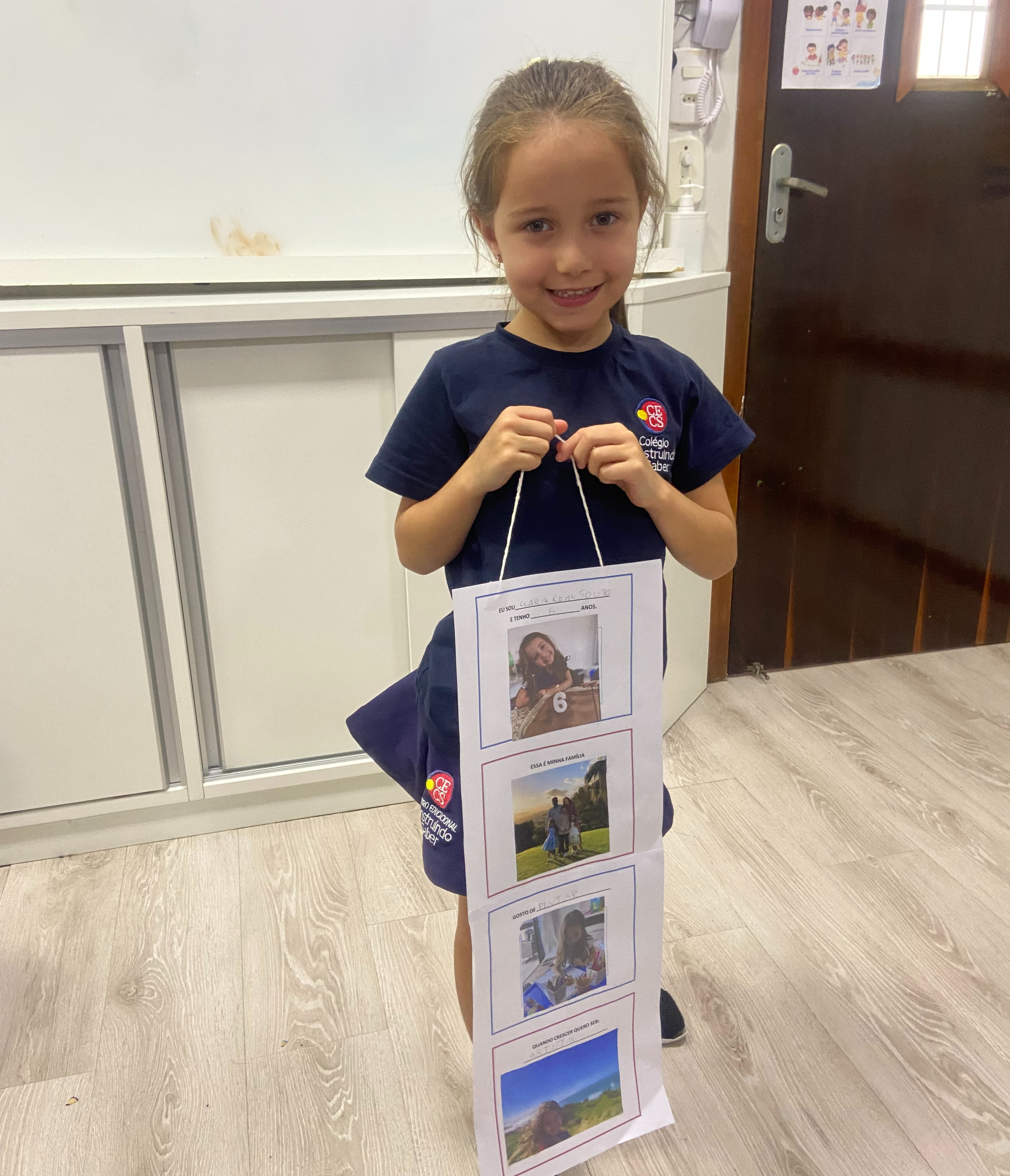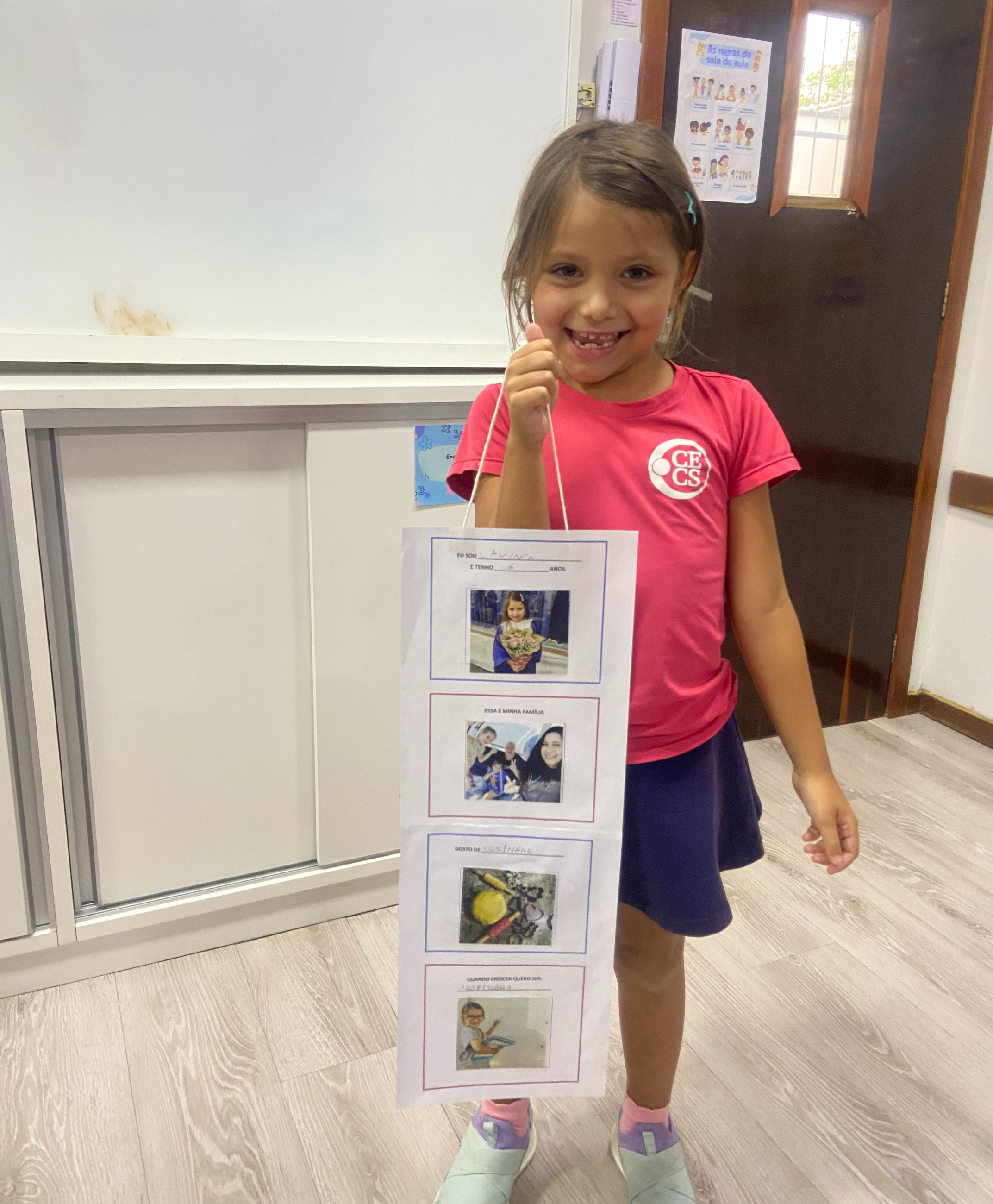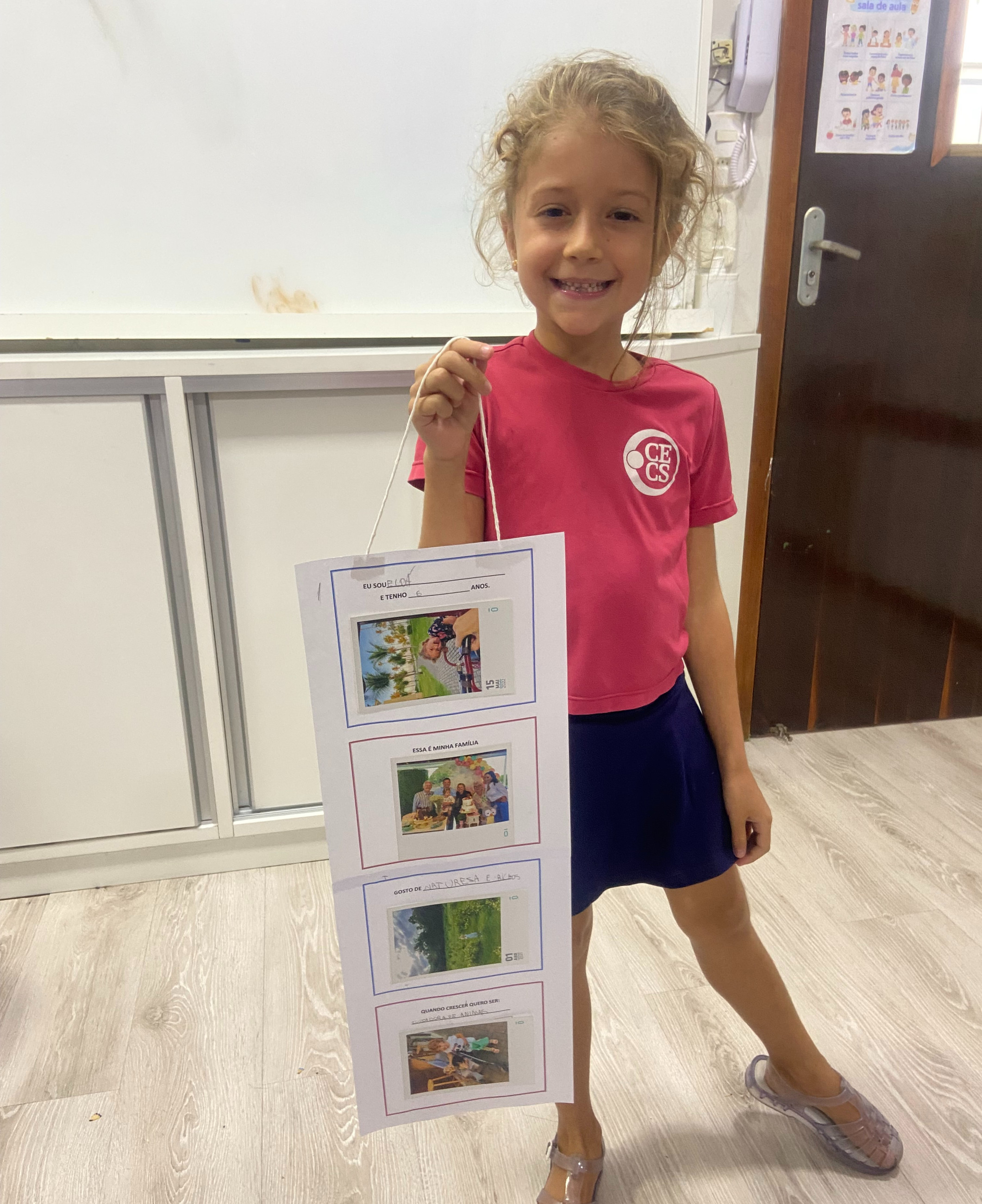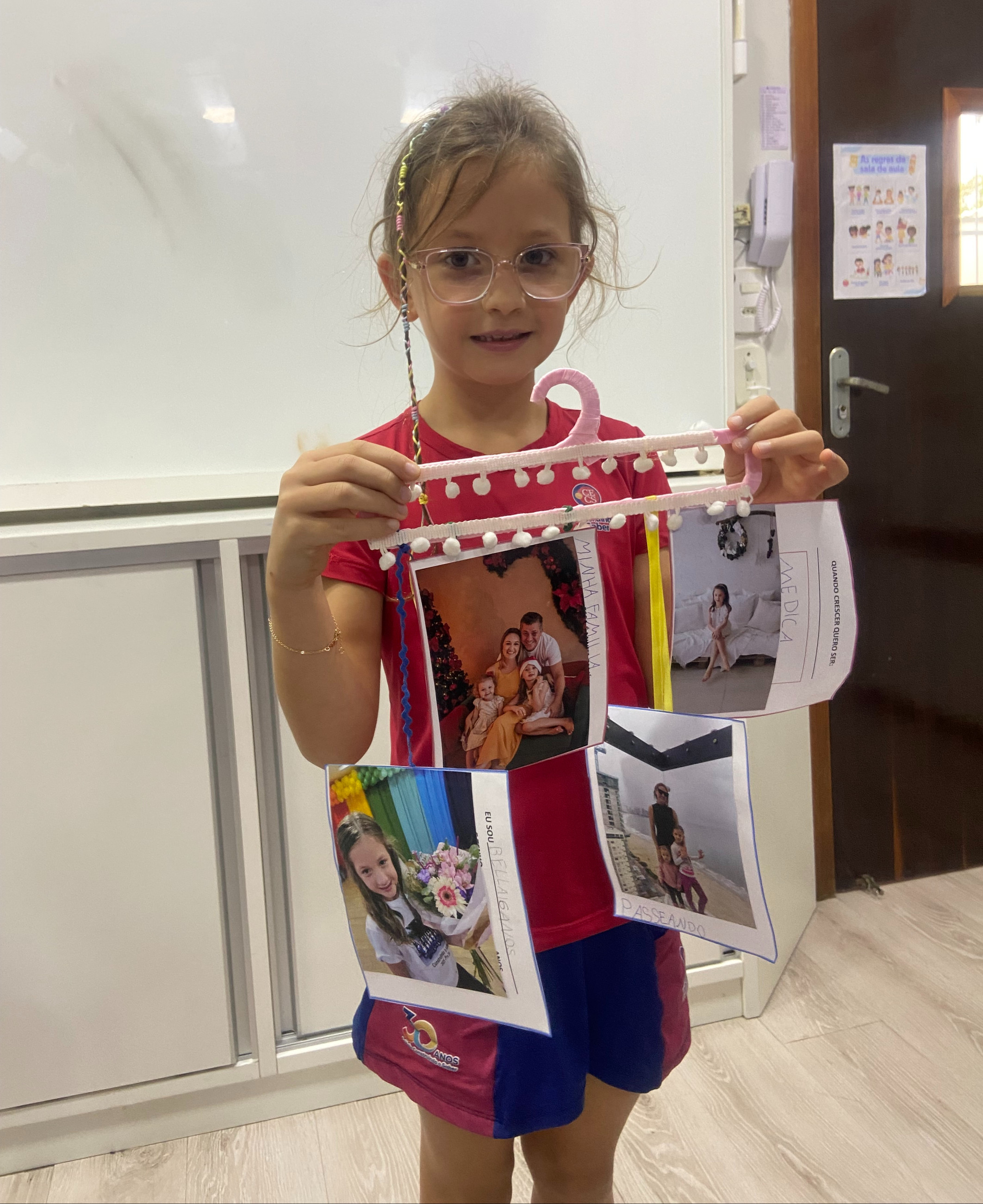 Em casa, cada criança, junto com seus familiares, preparou seu móbile com informações importantes sobre si mesma. Nele, puderam compartilhar seu nome, idade, quem faz parte de sua família, o que mais gostam de fazer e qual profissão sonham ter no futuro.