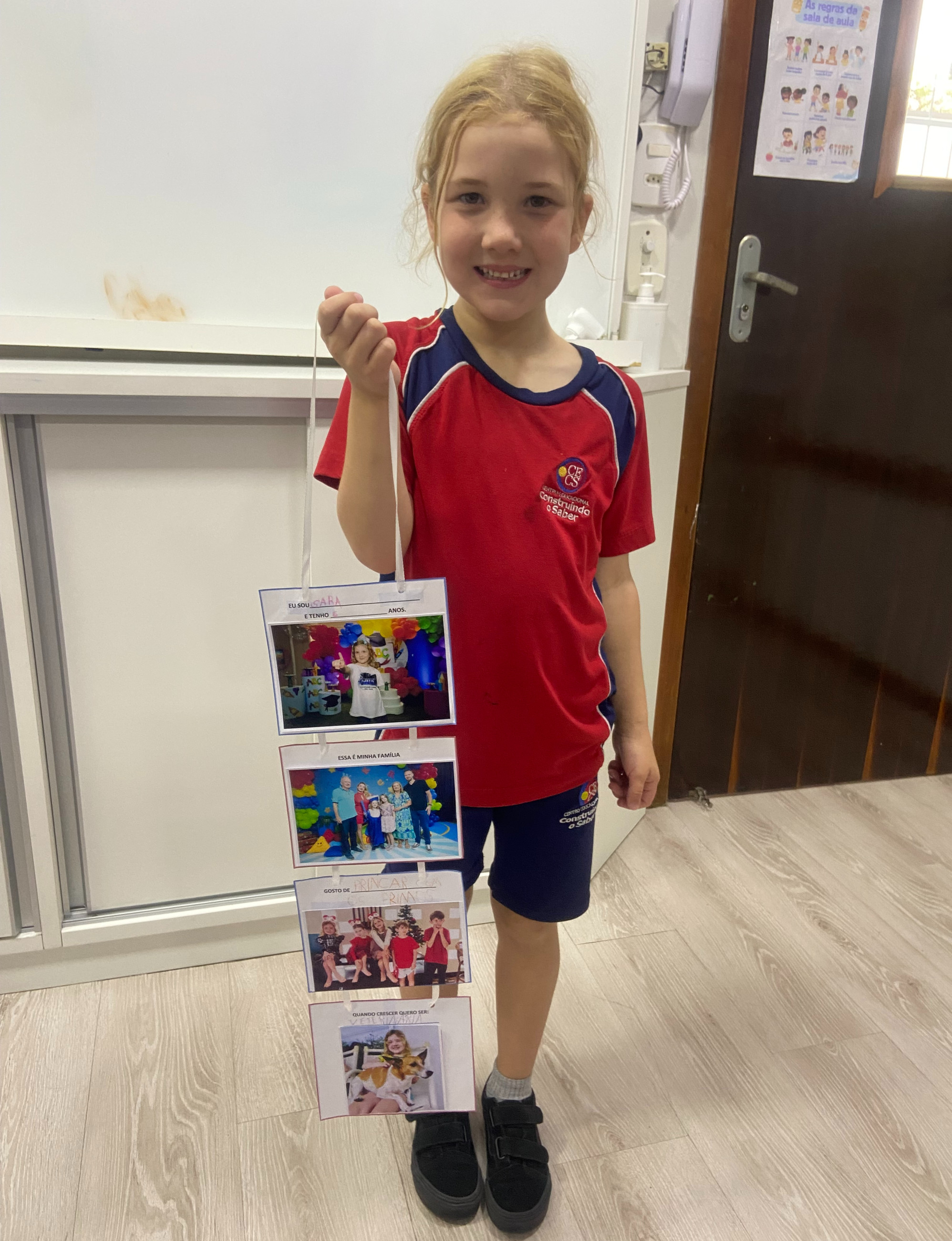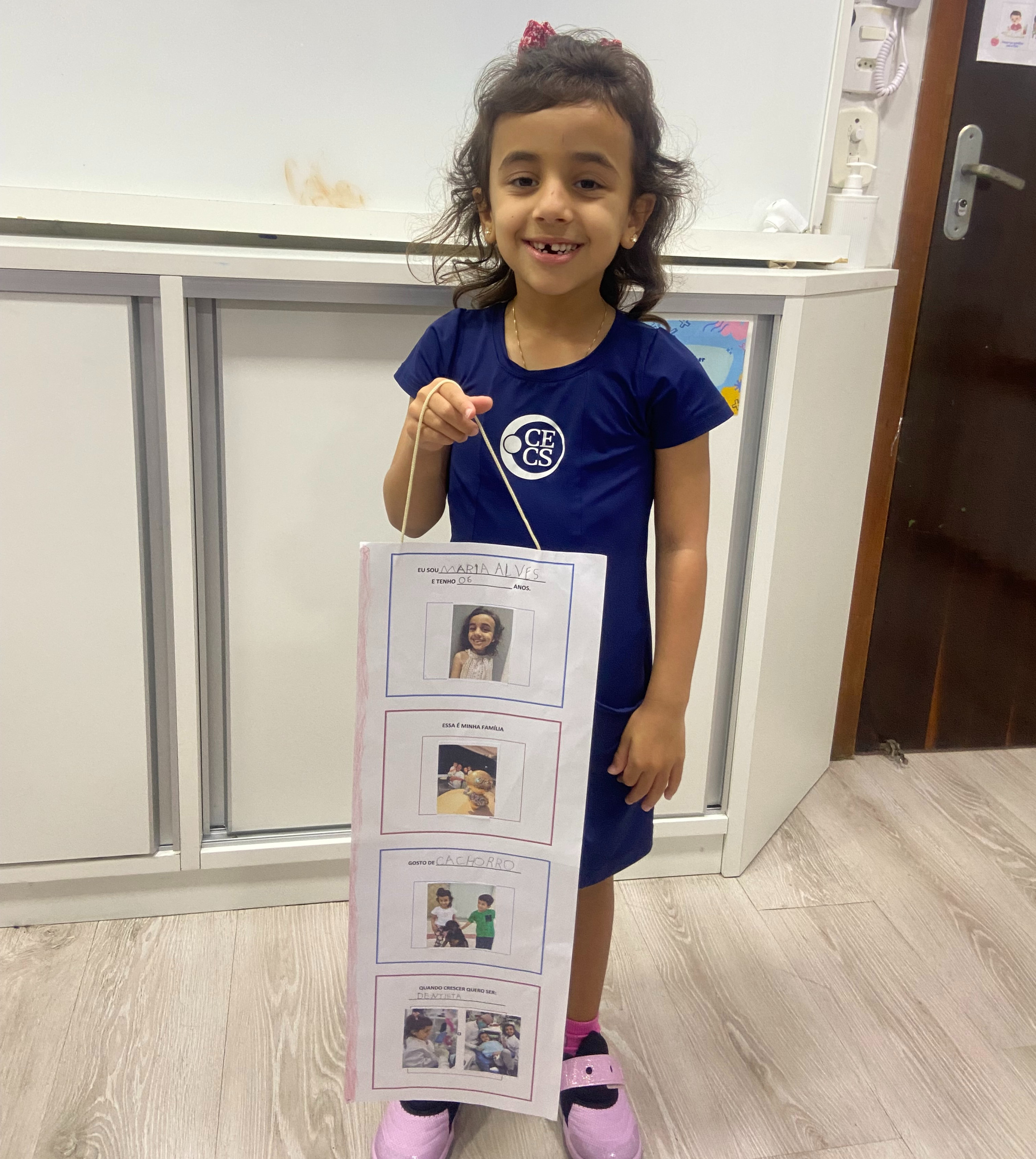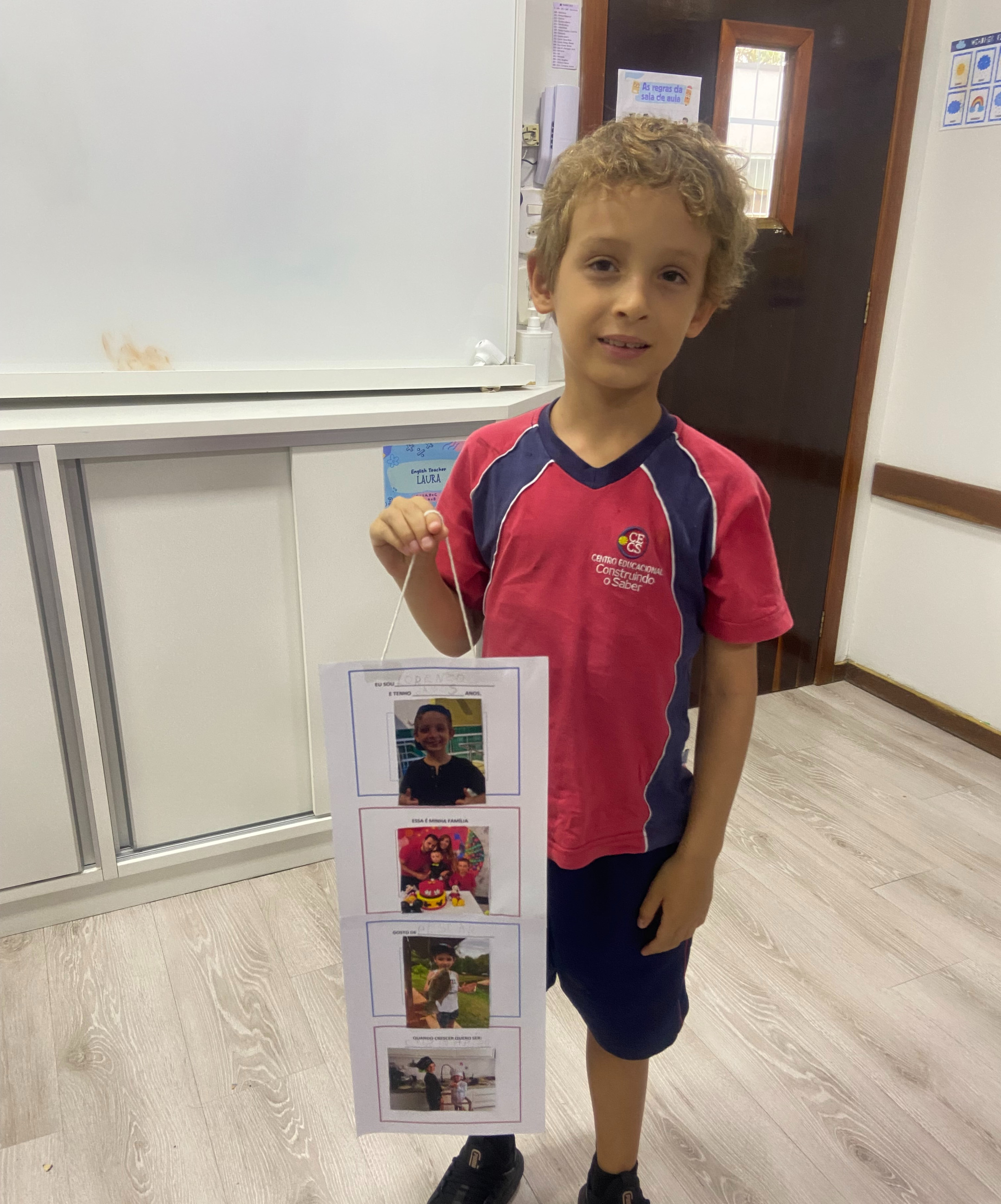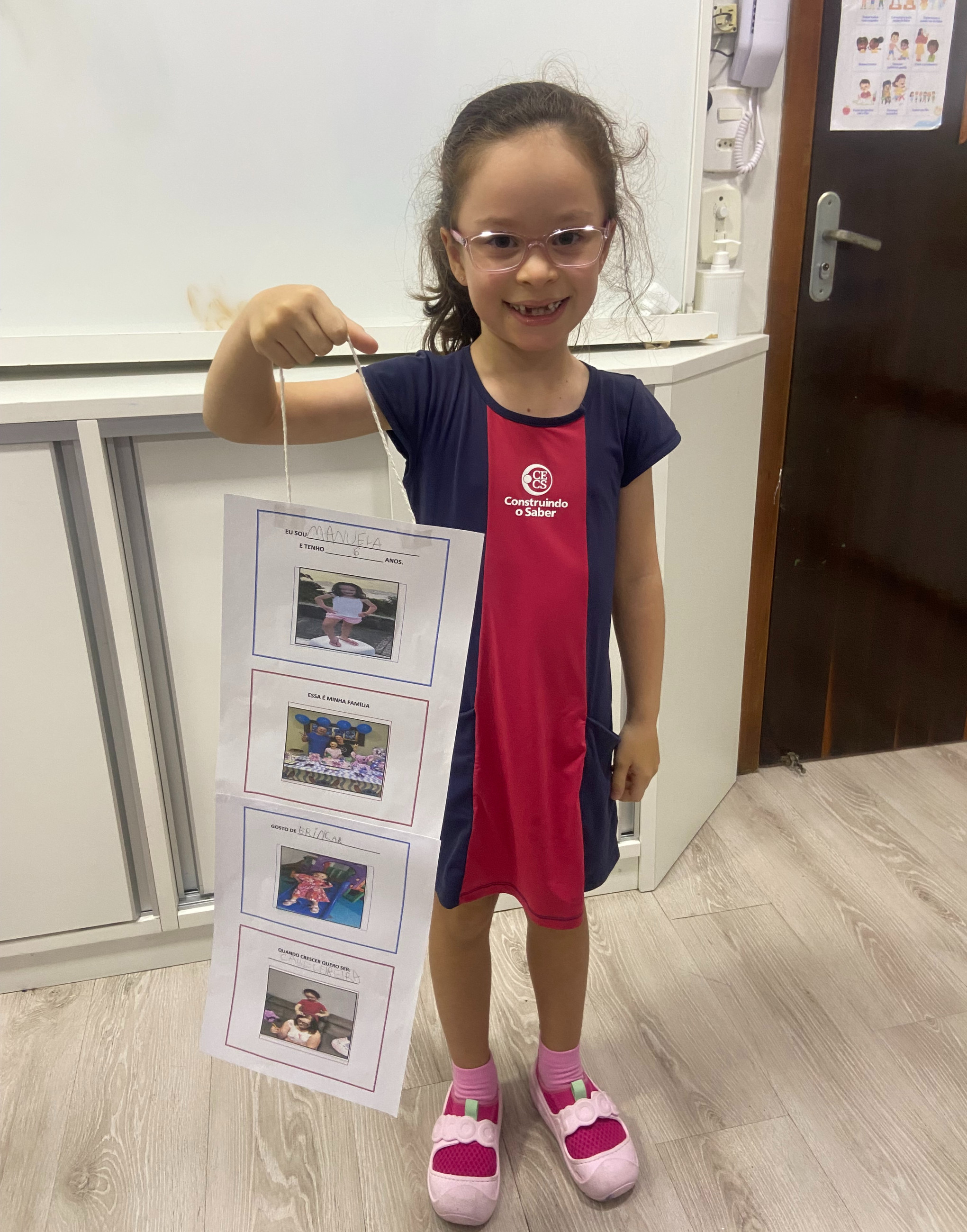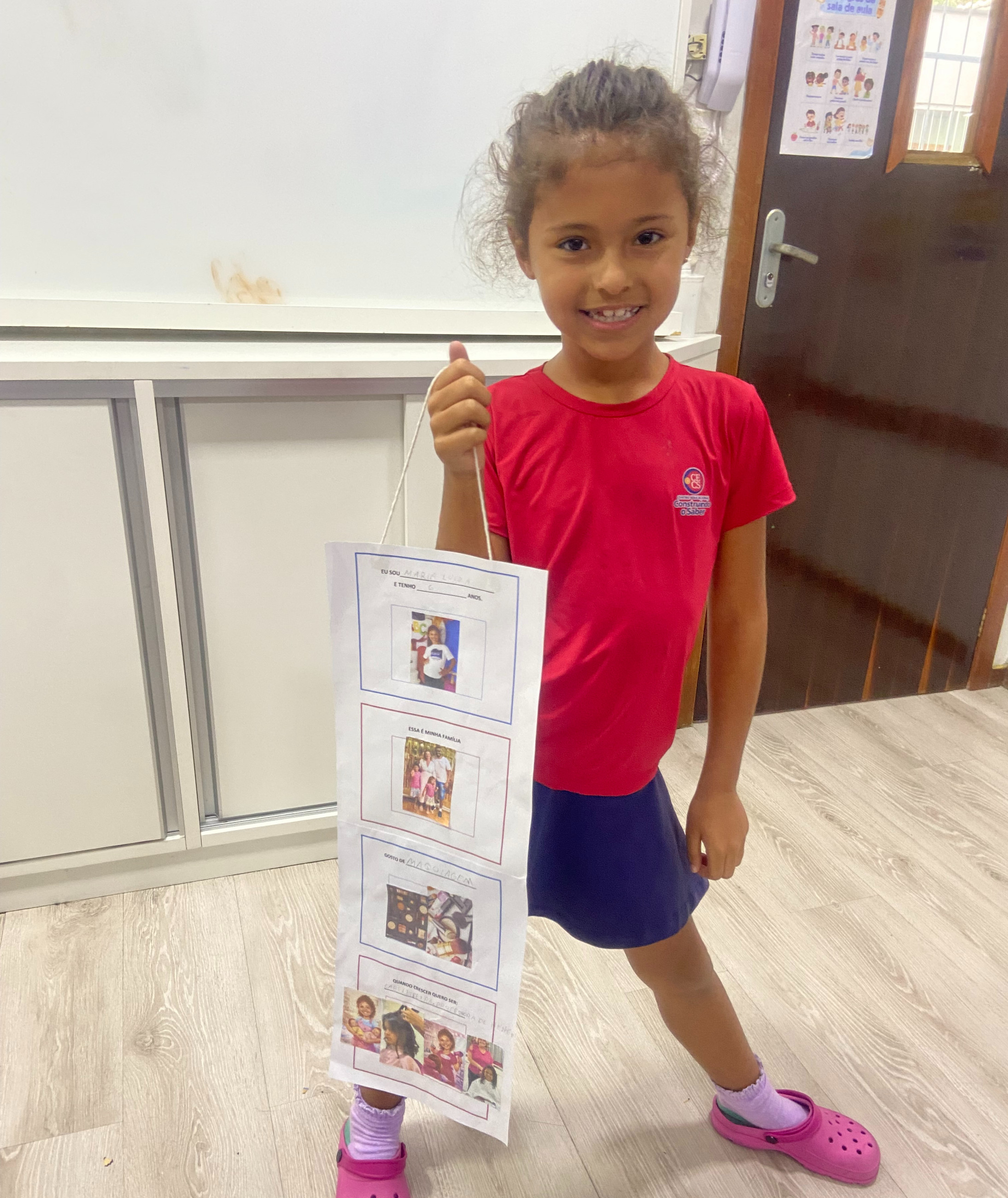 Em casa, cada criança, junto com seus familiares, preparou seu móbile com informações importantes sobre si mesma. Nele, puderam compartilhar seu nome, idade, quem faz parte de sua família, o que mais gostam de fazer e qual profissão sonham ter no futuro.