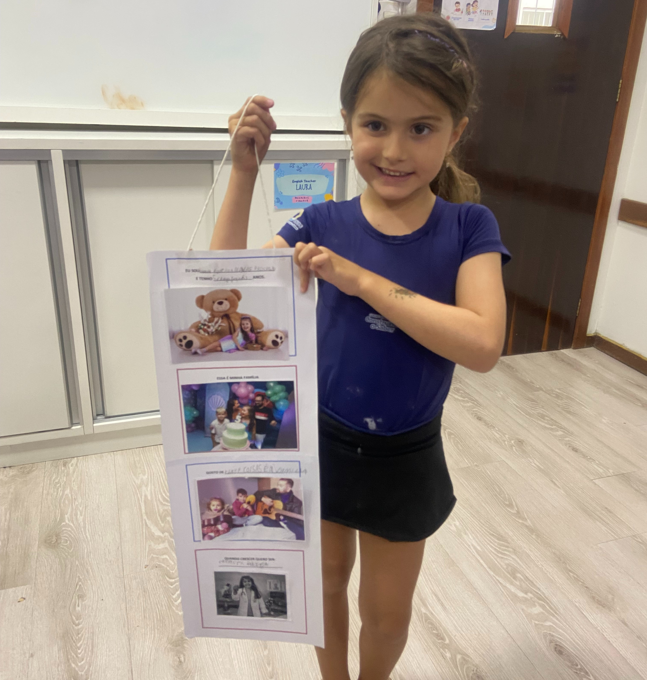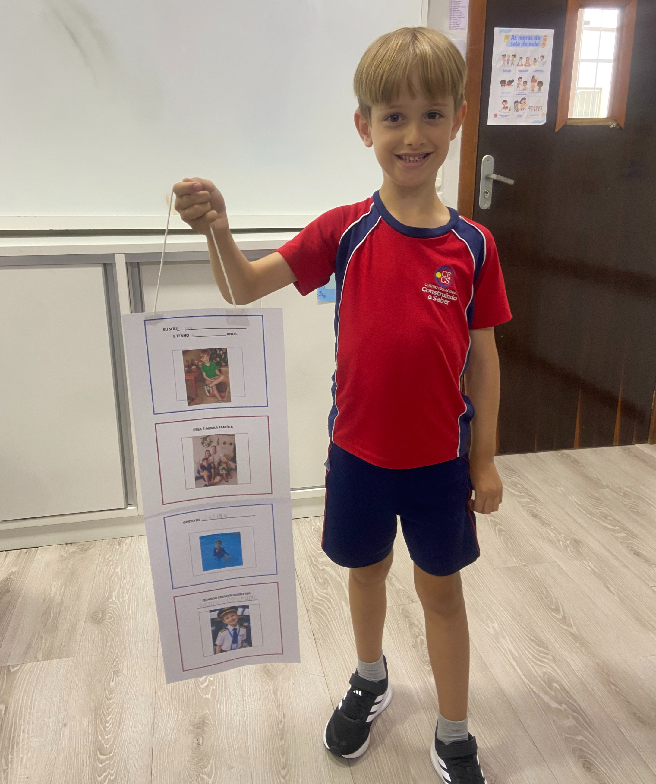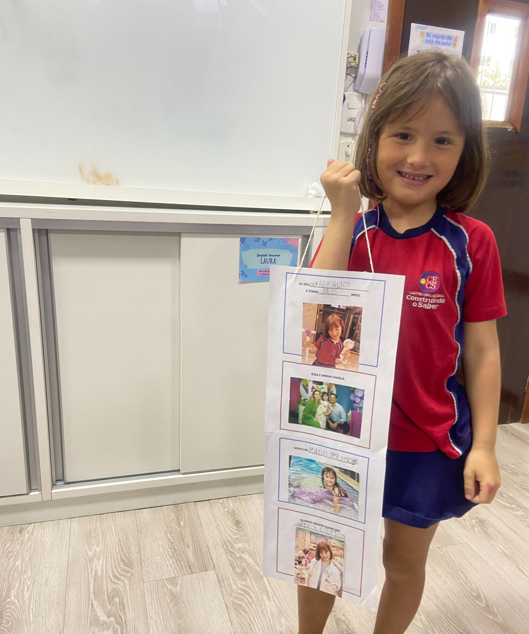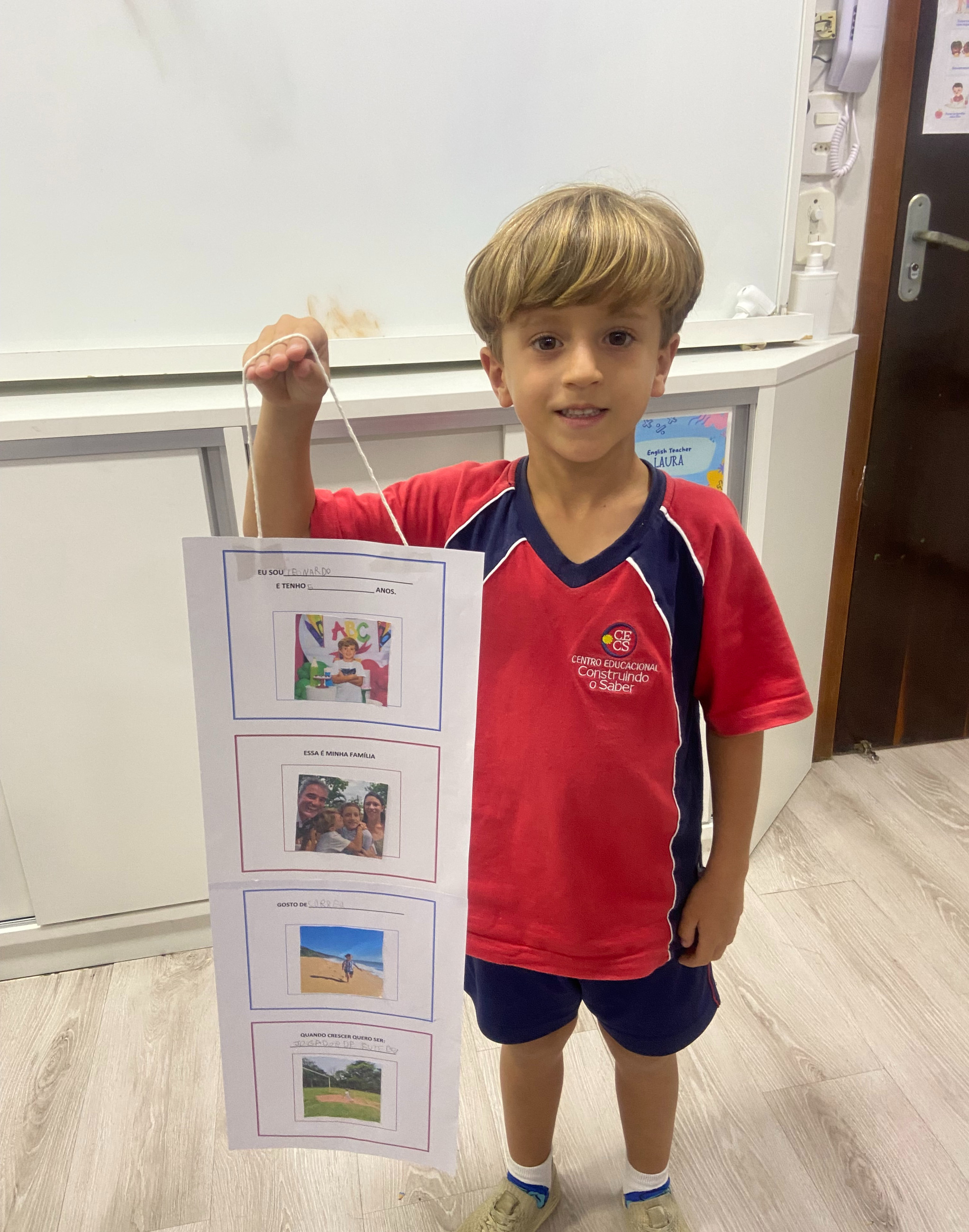 Em casa, cada criança, junto com seus familiares, preparou seu móbile com informações importantes sobre si mesma. Nele, puderam compartilhar seu nome, idade, quem faz parte de sua família, o que mais gostam de fazer e qual profissão sonham ter no futuro.