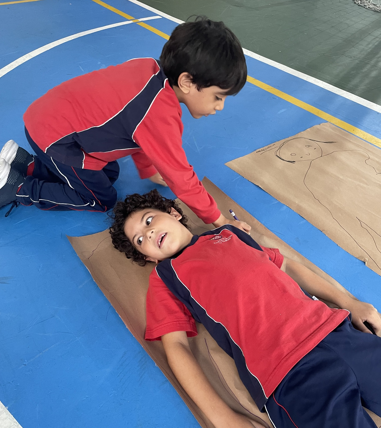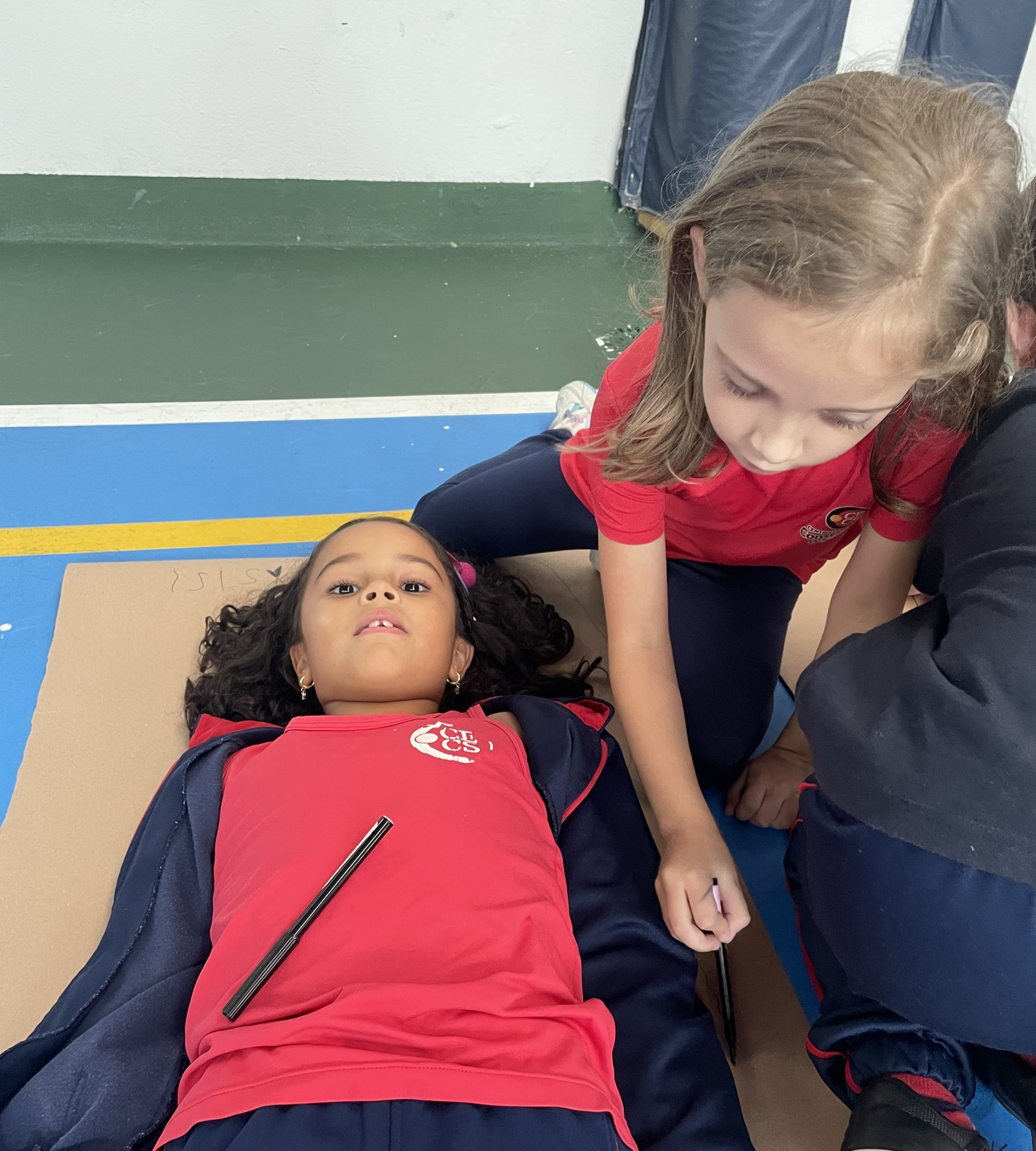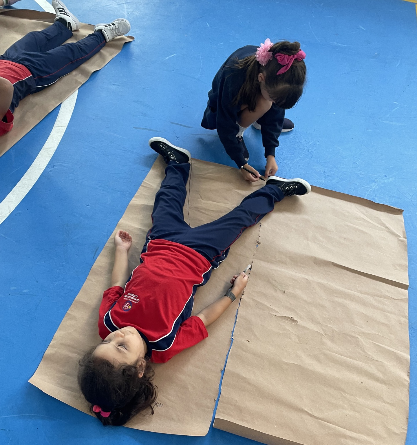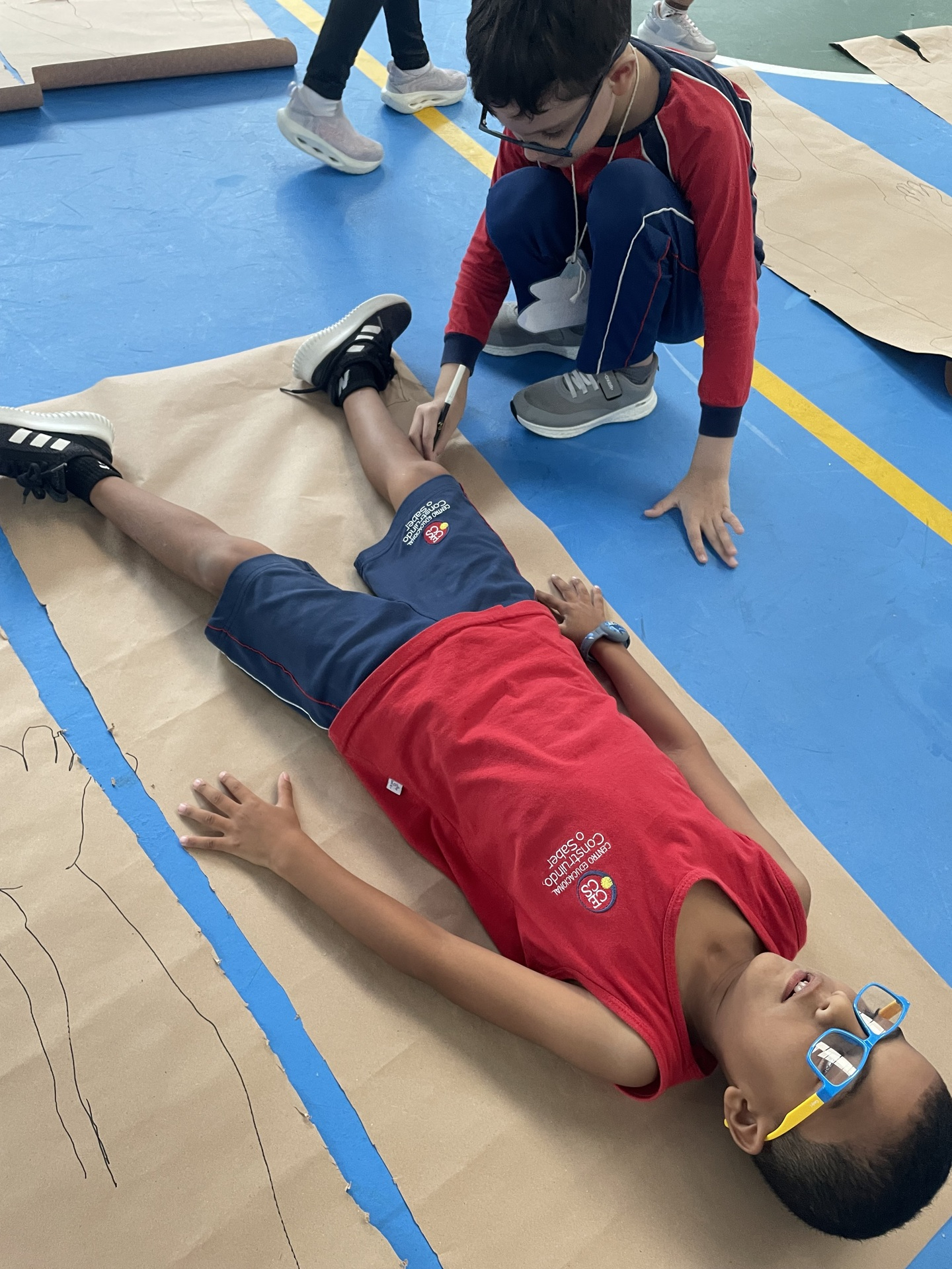 Para finalizar o tema, a turma se reuniu em duplas para uma atividade muito envolvente: cada aluno deitou sobre o papel pardo enquanto o colega contornava seu corpo com canetão, criando um desenho em tamanho real. A experiência despertou curiosidade, atenção e colaboração, além de tornar o aprendizado ainda mais visual e marcante.