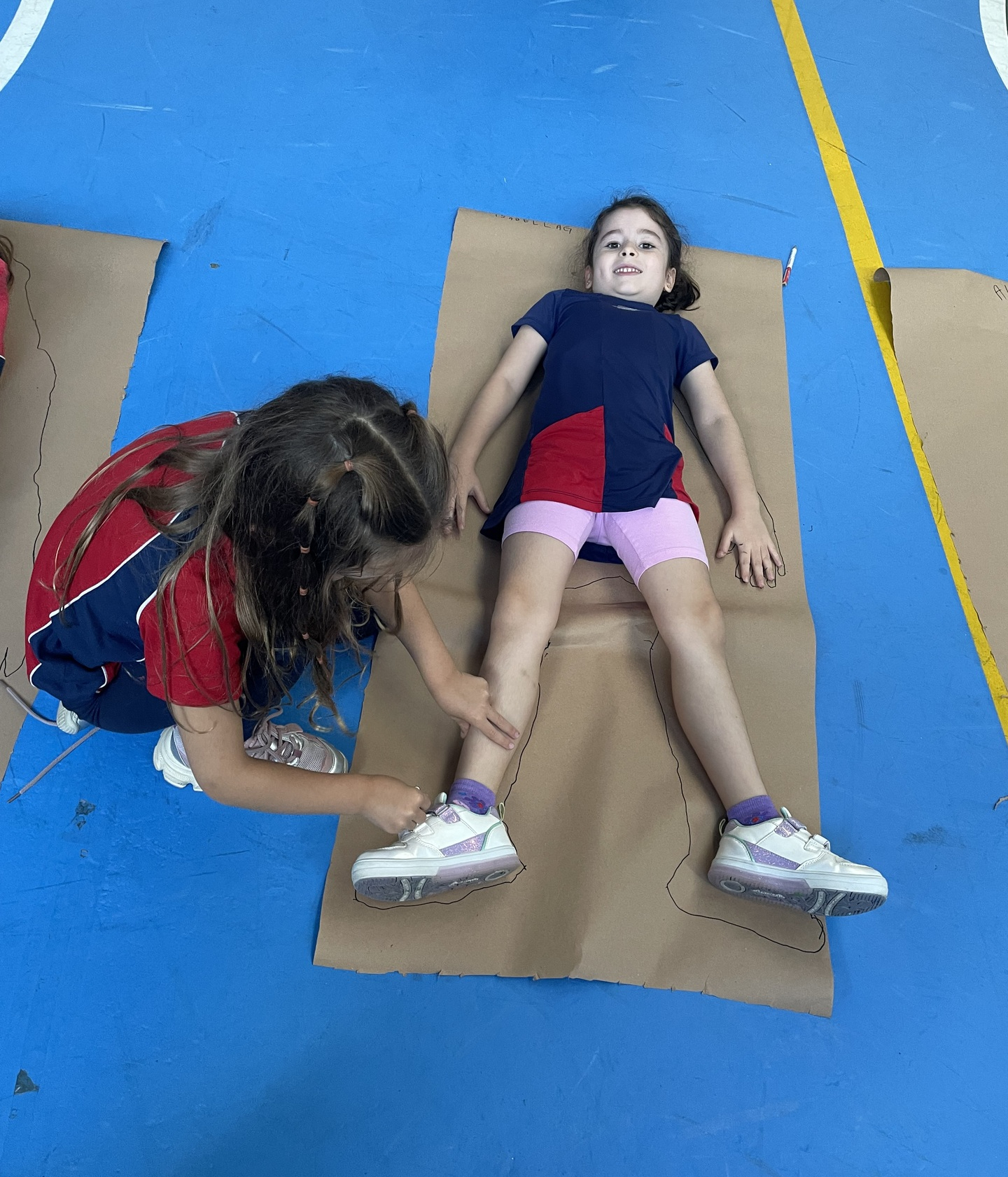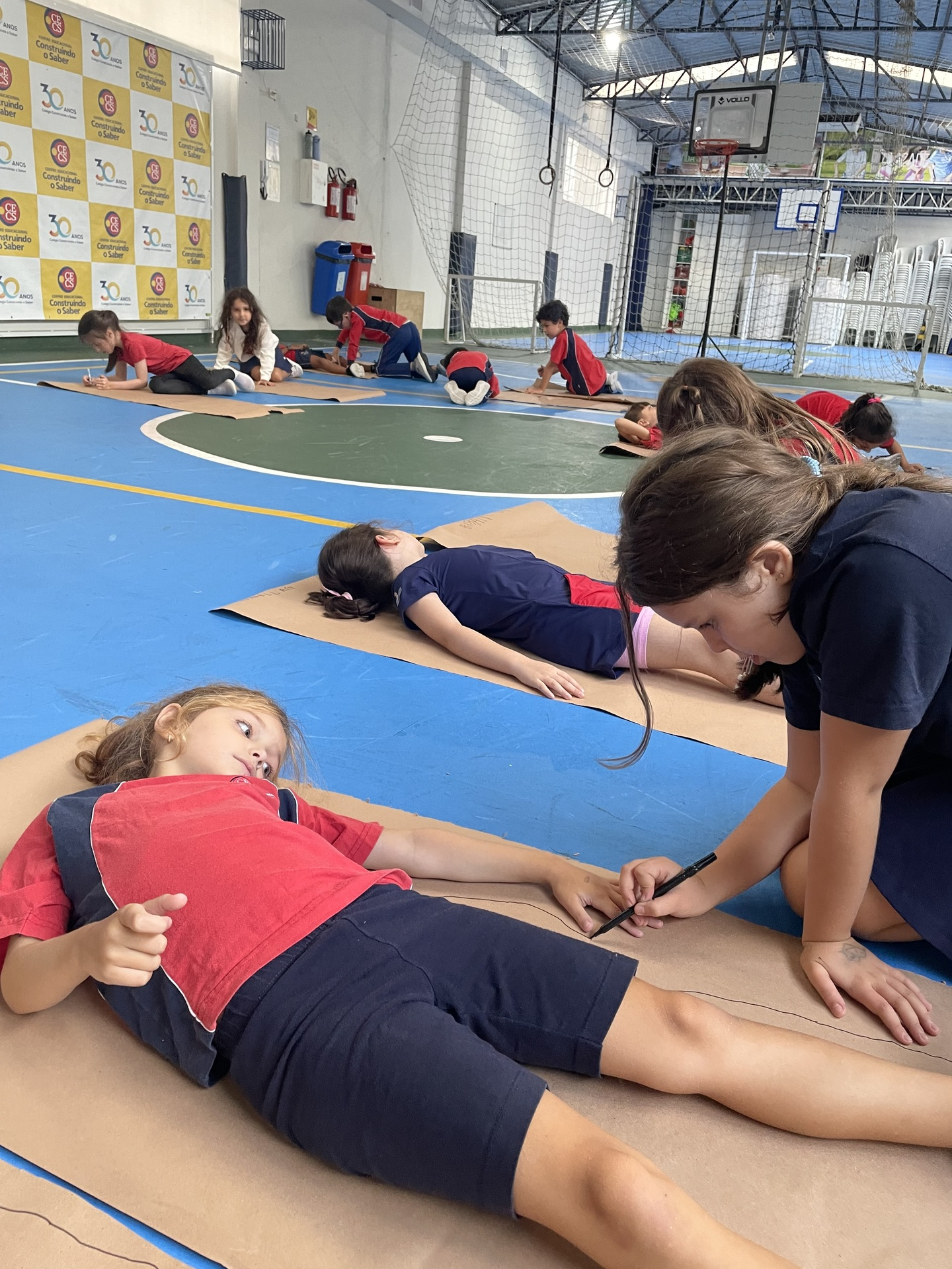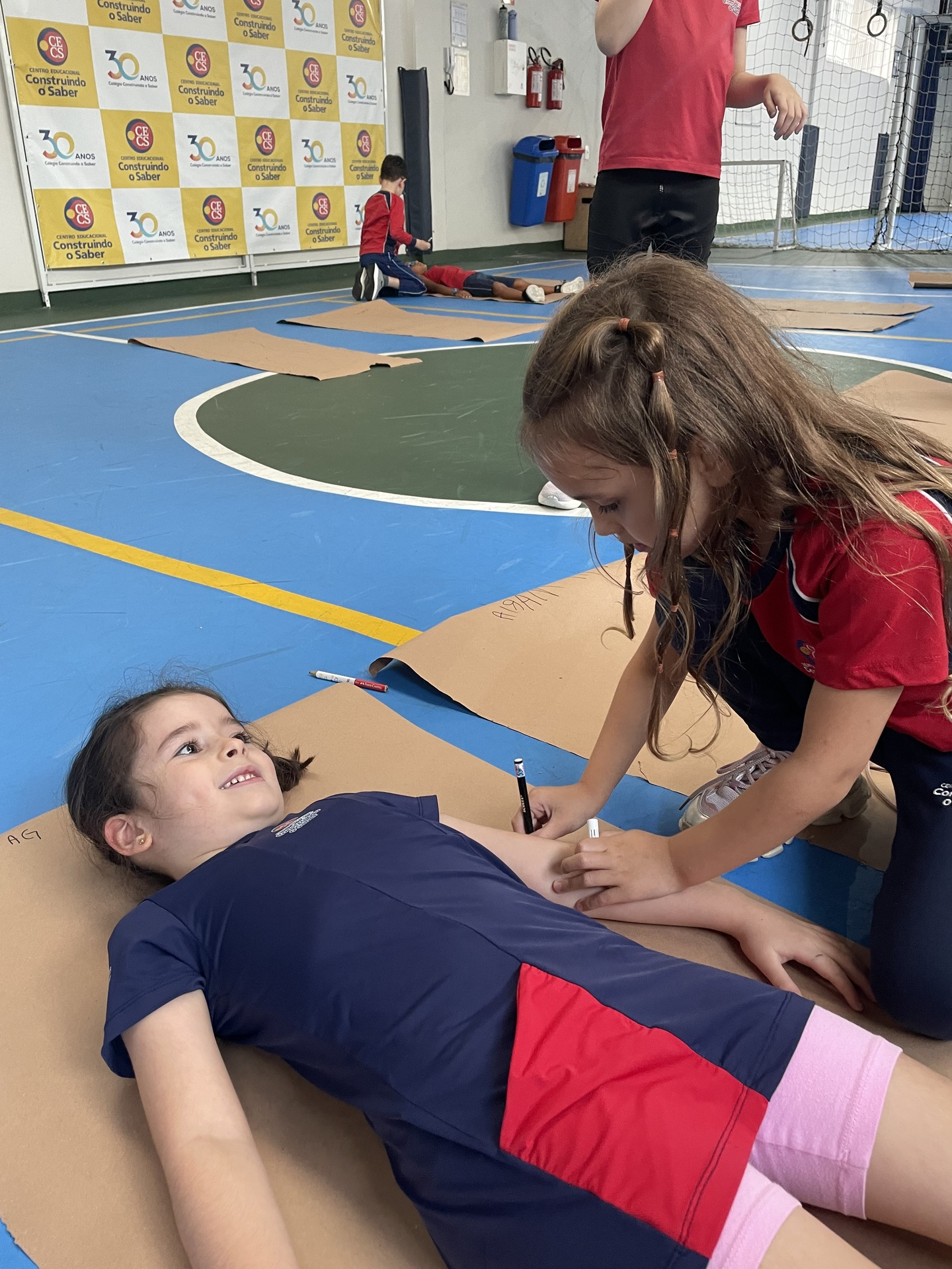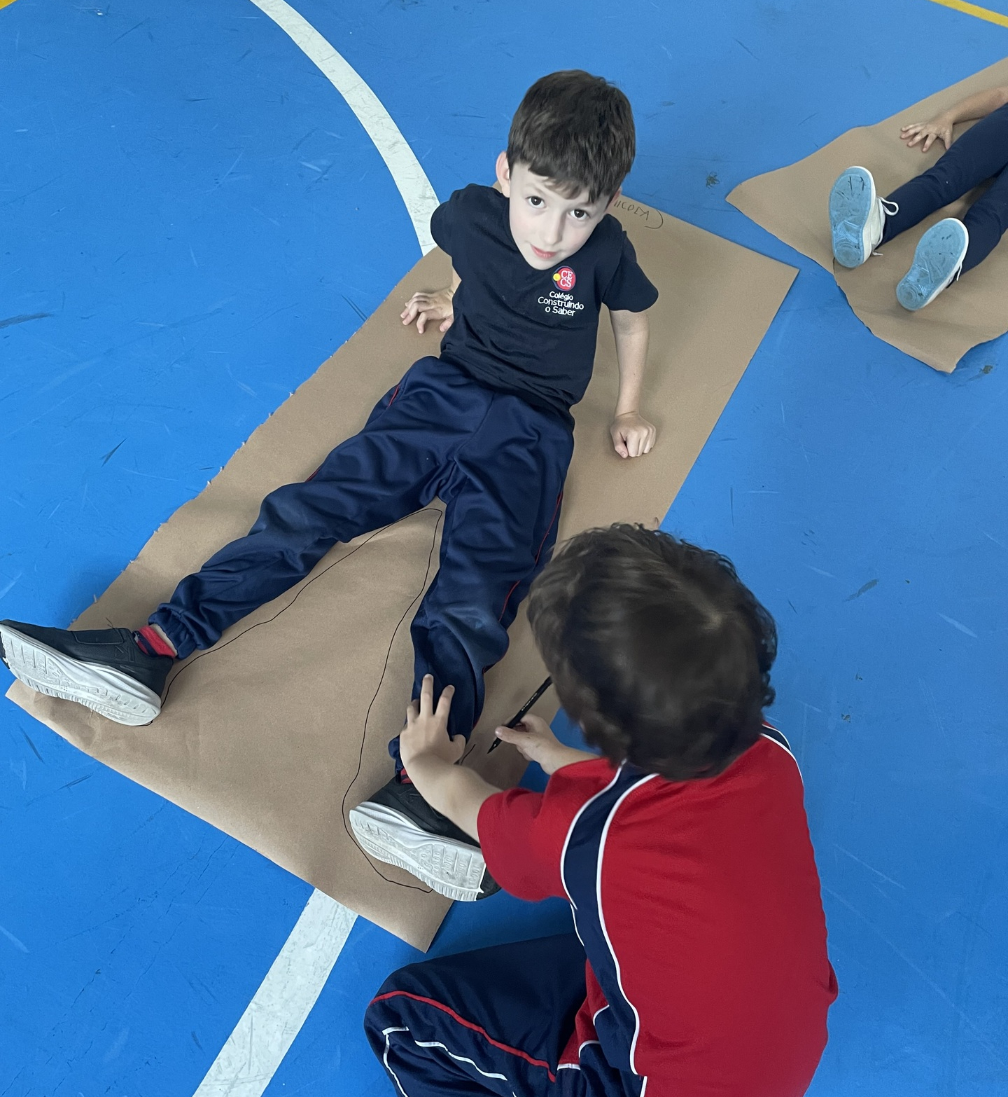 Para finalizar o tema, a turma se reuniu em duplas para uma atividade muito envolvente: cada aluno deitou sobre o papel pardo enquanto o colega contornava seu corpo com canetão, criando um desenho em tamanho real. A experiência despertou curiosidade, atenção e colaboração, além de tornar o aprendizado ainda mais visual e marcante.
