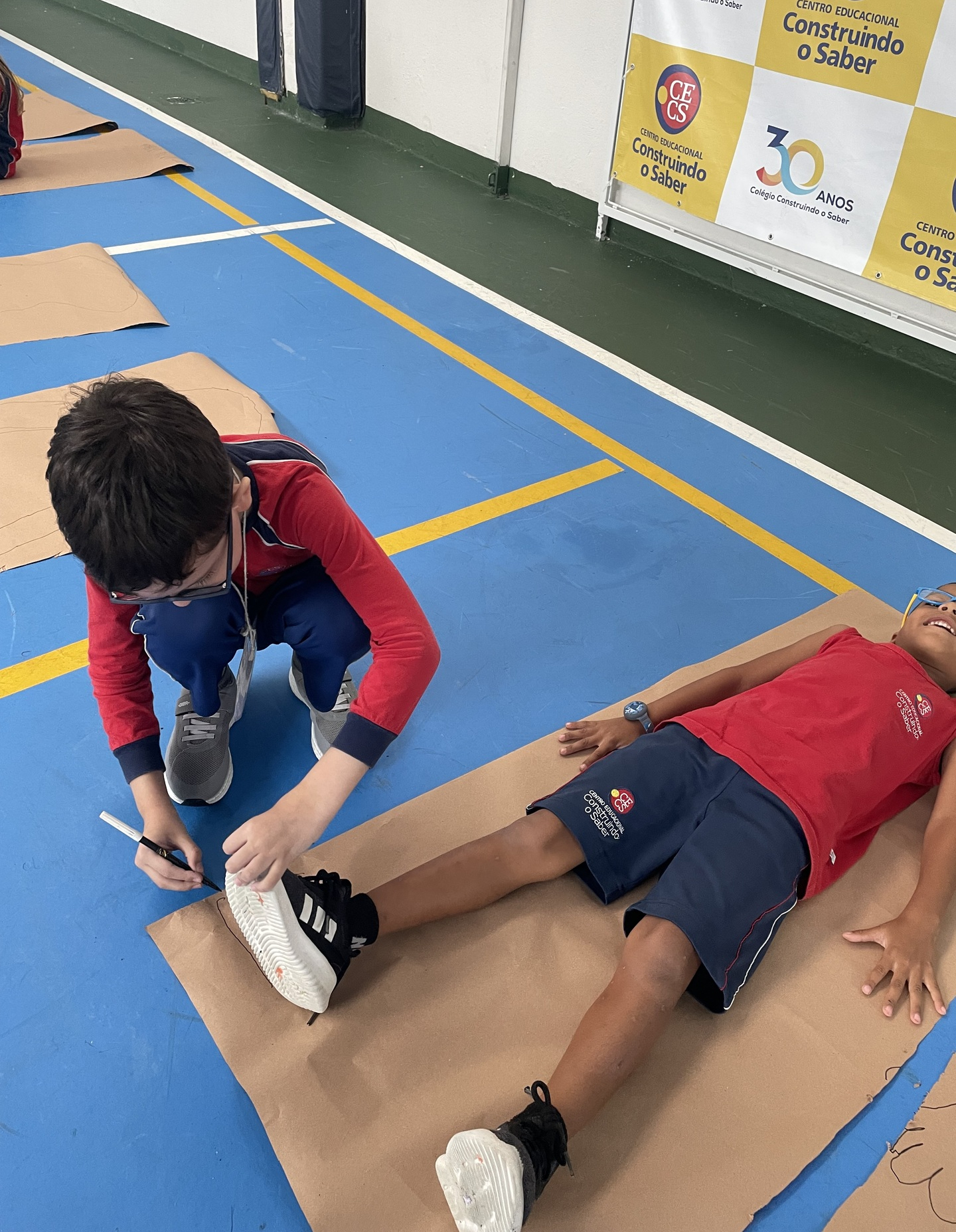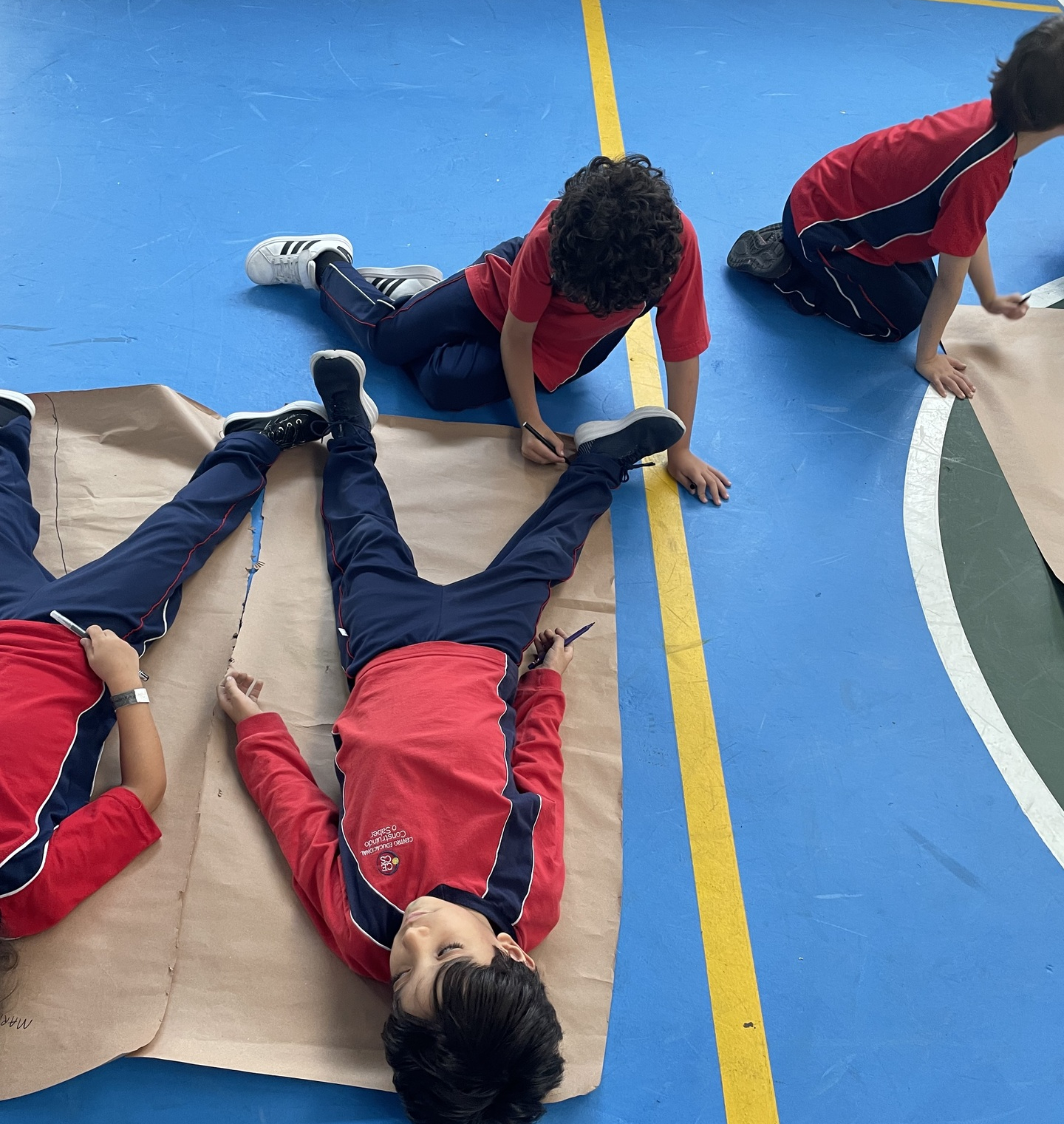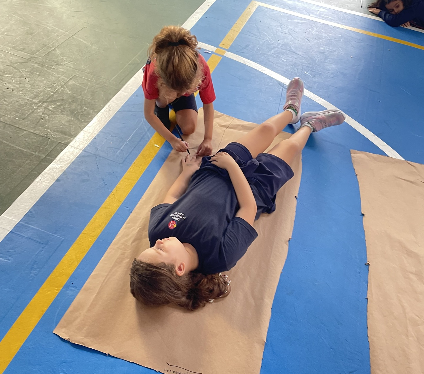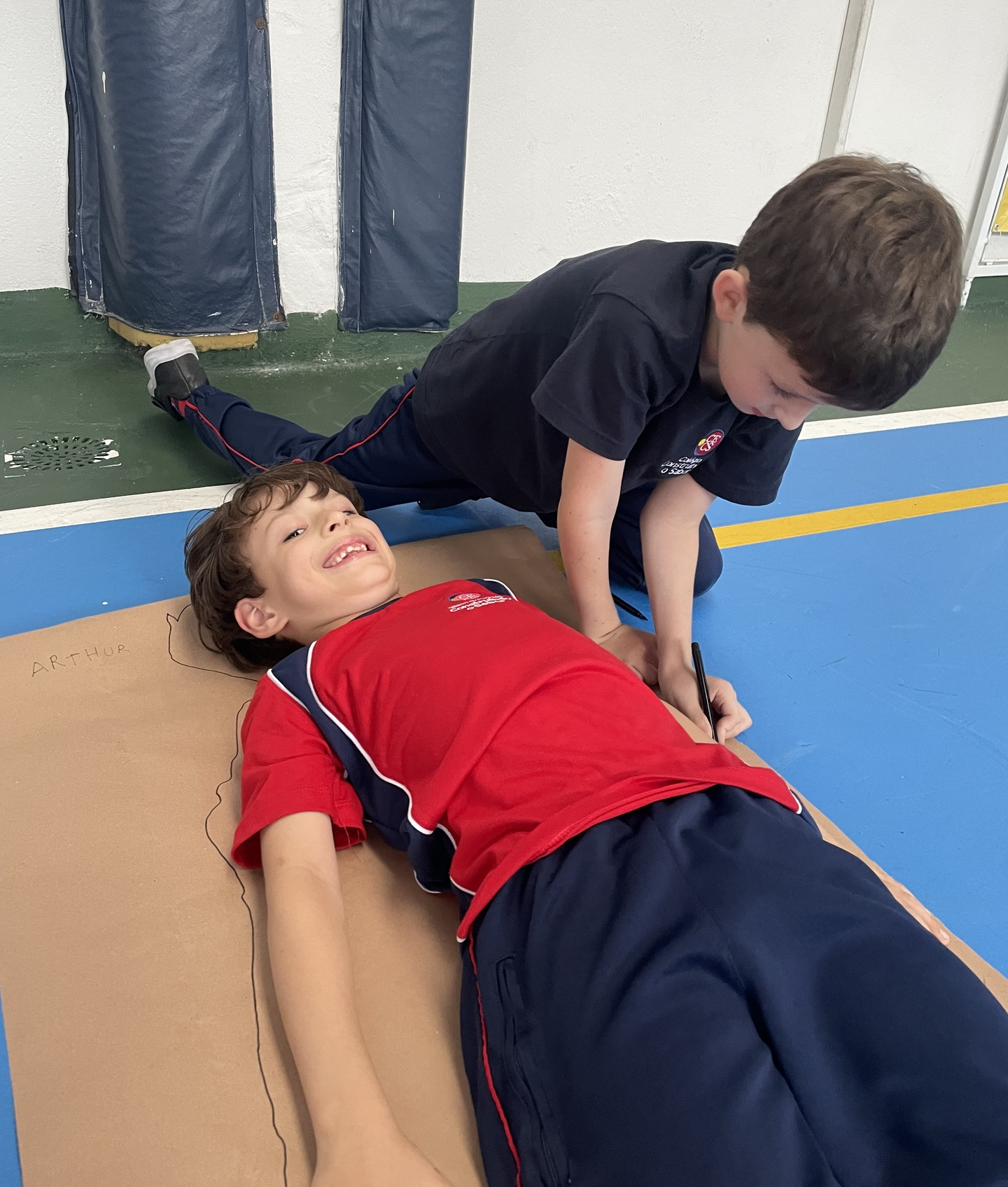 Para finalizar o tema, a turma se reuniu em duplas para uma atividade muito envolvente: cada aluno deitou sobre o papel pardo enquanto o colega contornava seu corpo com canetão, criando um desenho em tamanho real. A experiência despertou curiosidade, atenção e colaboração, além de tornar o aprendizado ainda mais visual e marcante.
