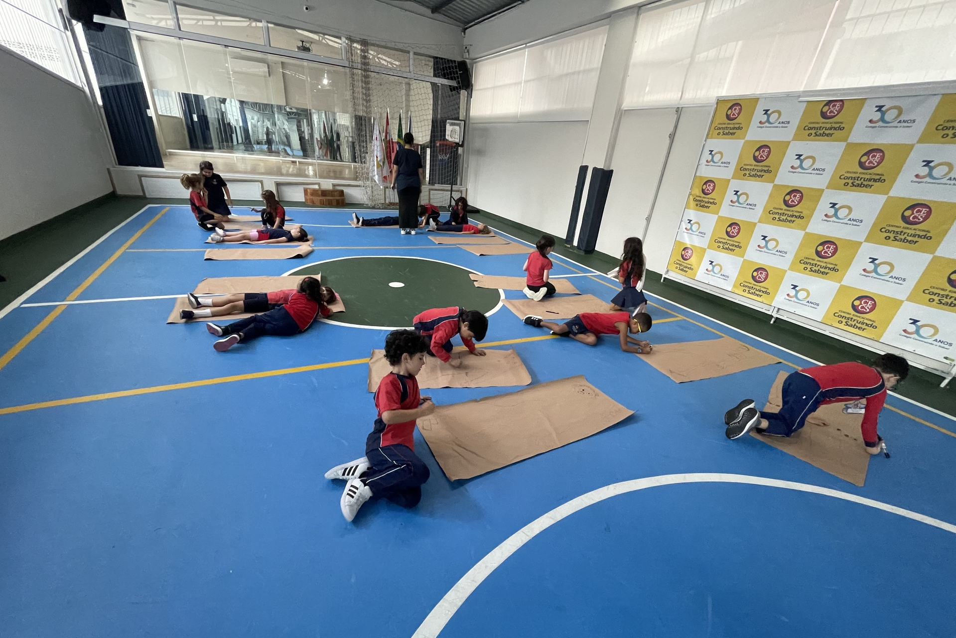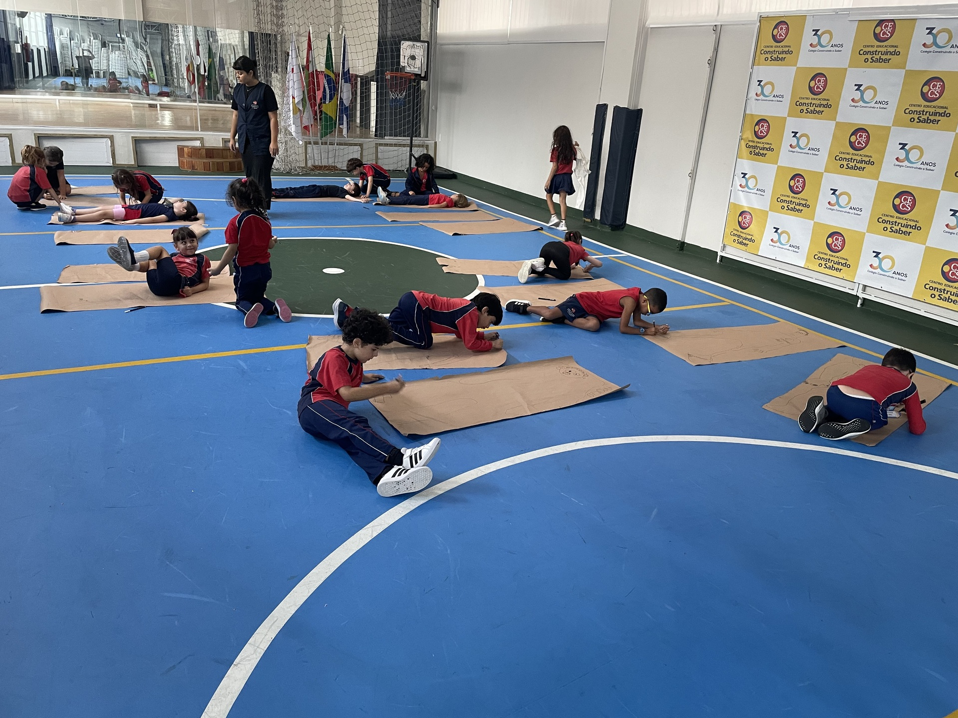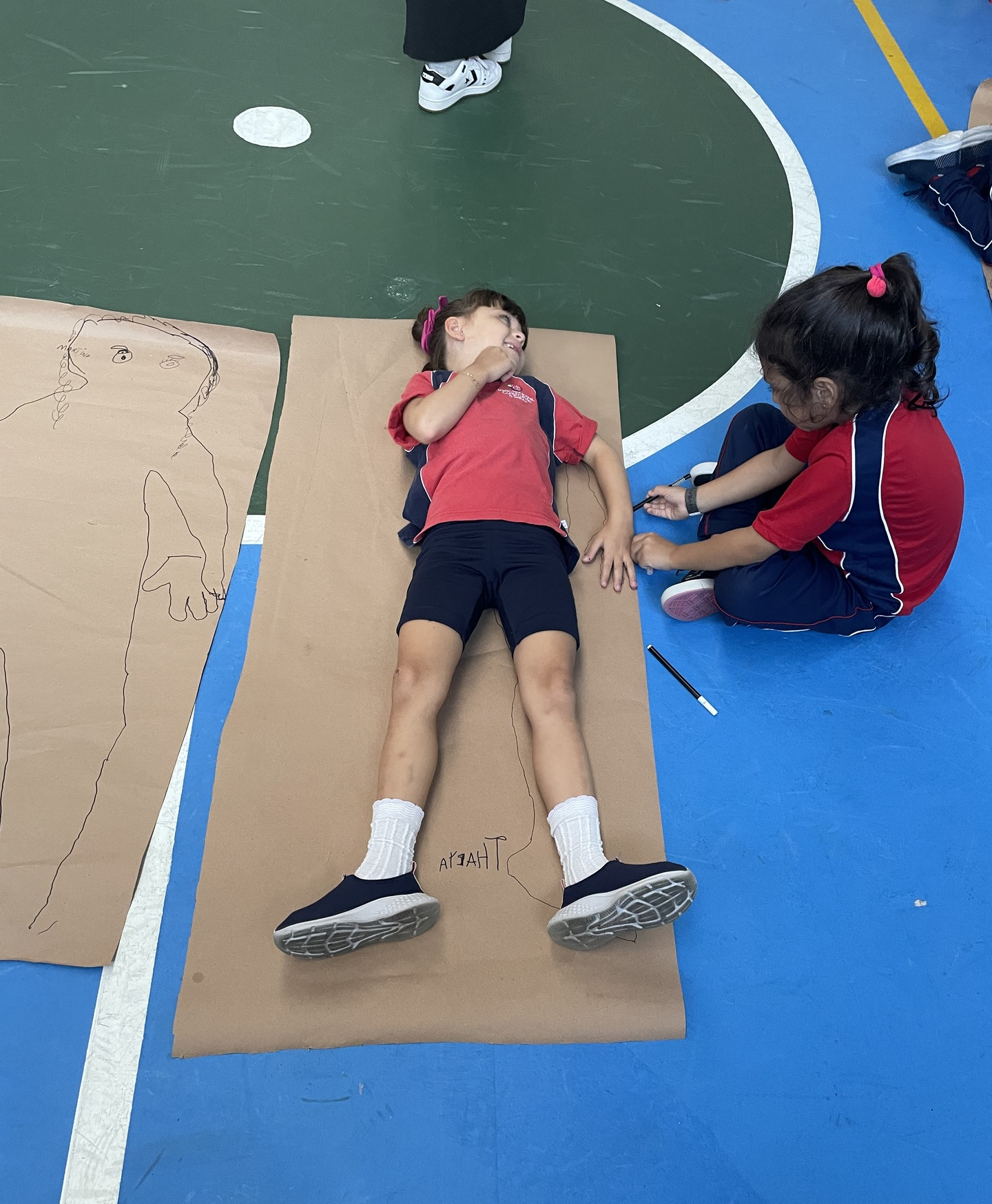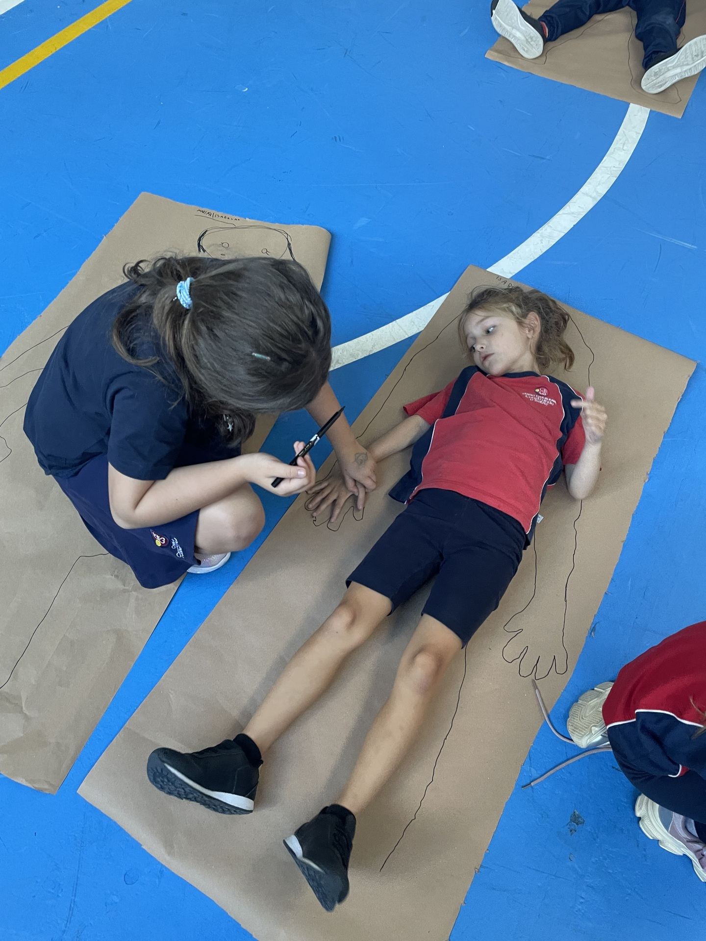 Para finalizar o tema, a turma se reuniu em duplas para uma atividade muito envolvente: cada aluno deitou sobre o papel pardo enquanto o colega contornava seu corpo com canetão, criando um desenho em tamanho real. A experiência despertou curiosidade, atenção e colaboração, além de tornar o aprendizado ainda mais visual e marcante.