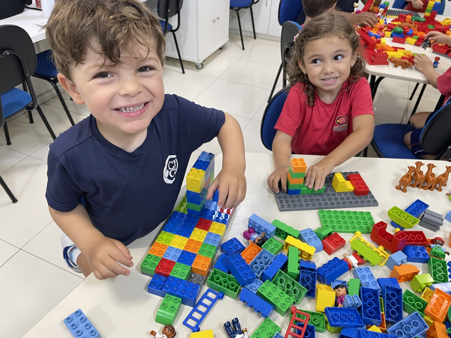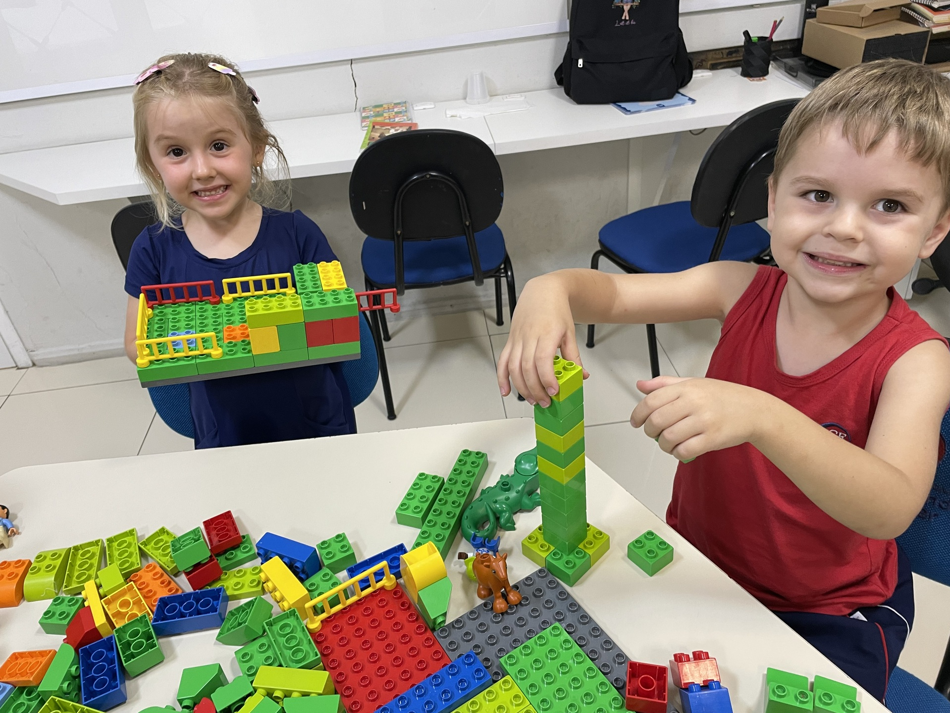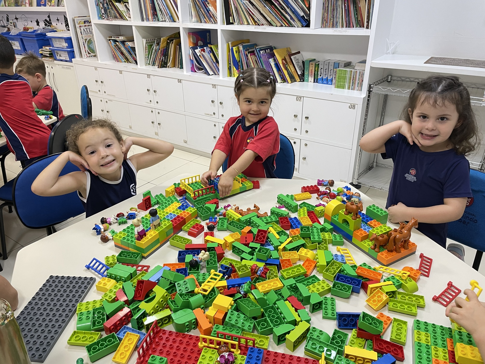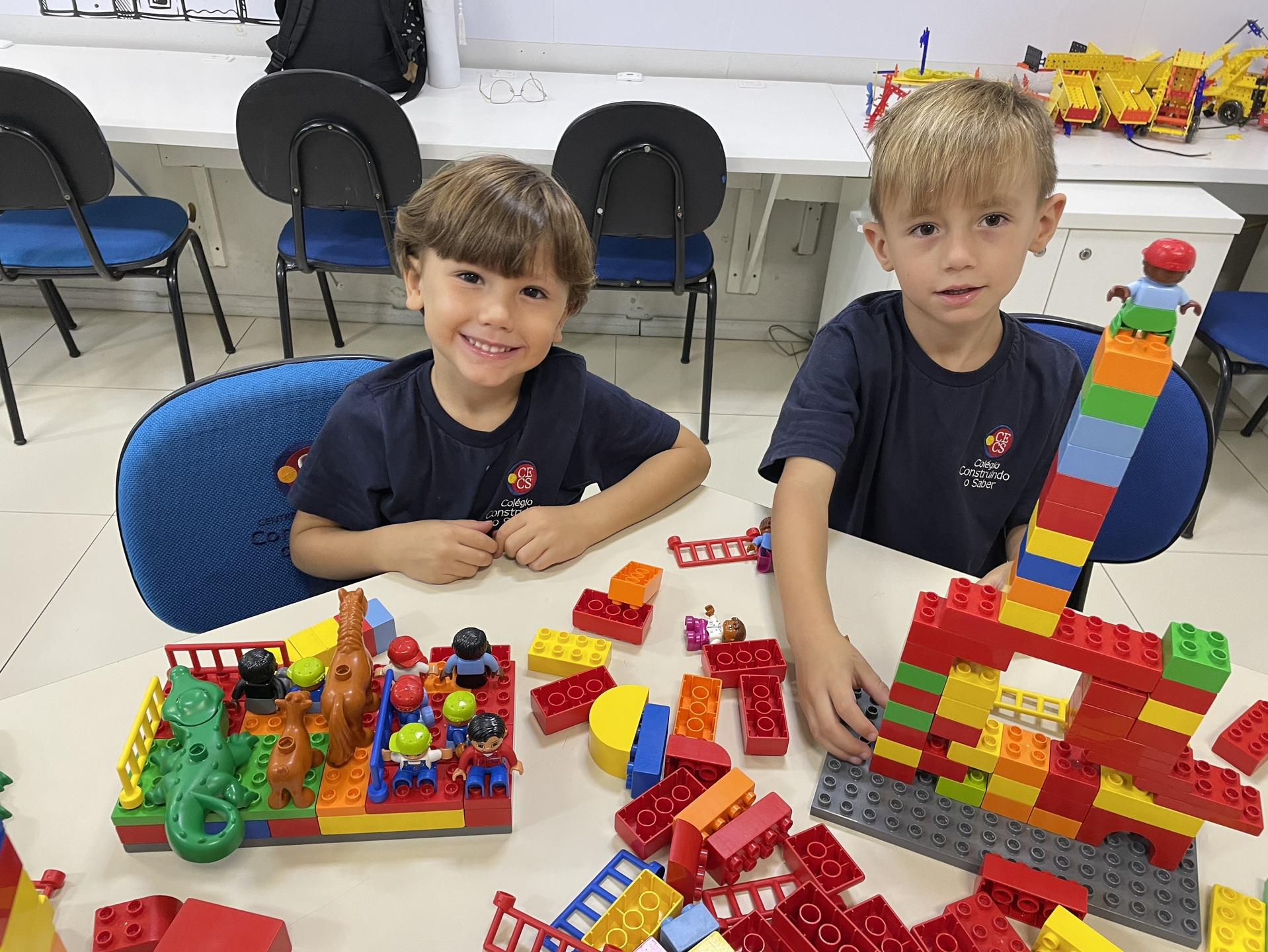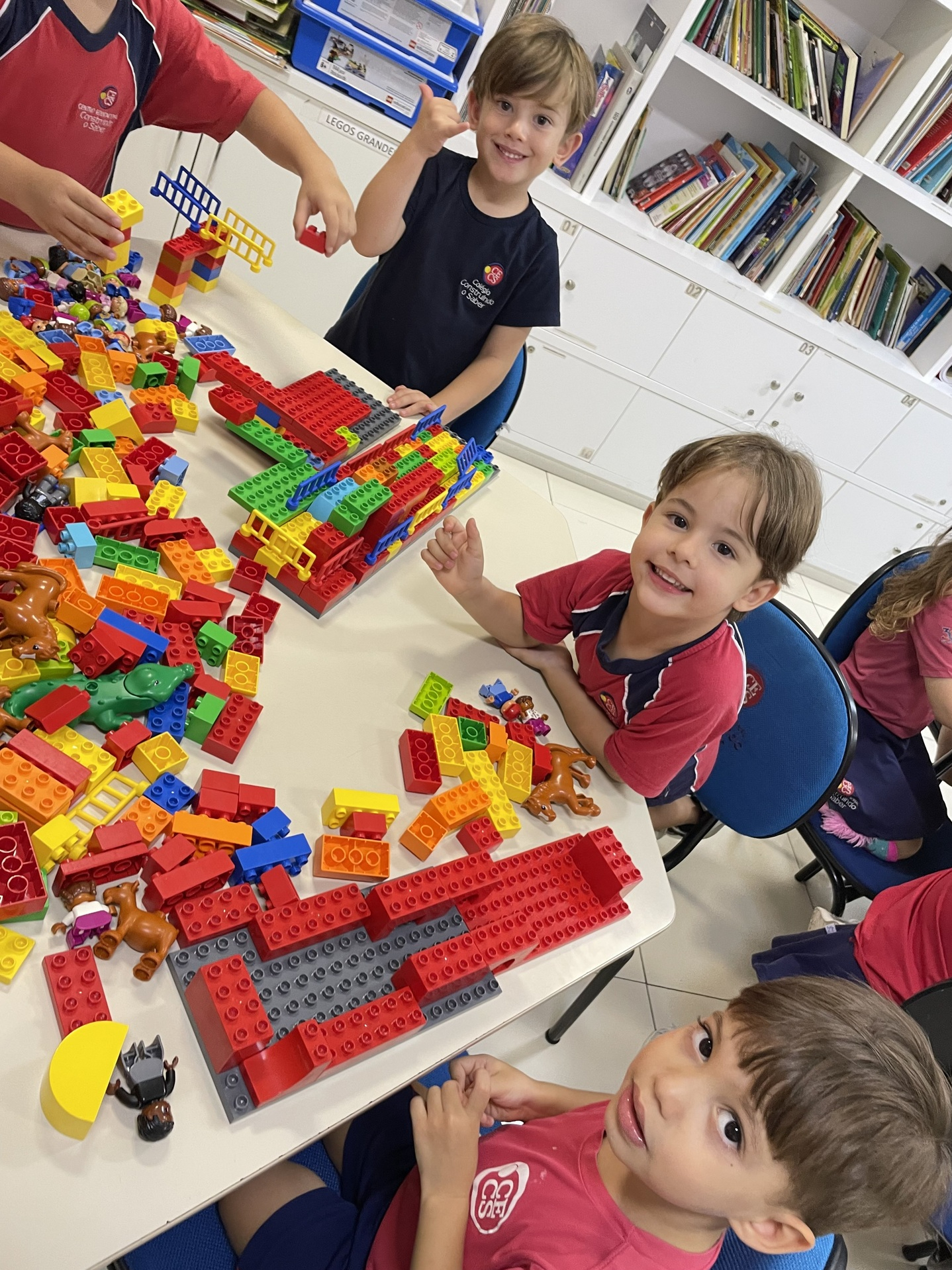 Durante a atividade, as crianças exploram o universo LEGO de forma livre e orientada, construindo, testando ideias e dando forma à própria imaginação. A cada encontro, novos desafios são propostos, incentivando o raciocínio, a organização do pensamento e a resolução de problemas de maneira leve e envolvente. Além disso, o uso do inglês acontece de forma natural, inserido no contexto da brincadeira e da interação entre os alunos.